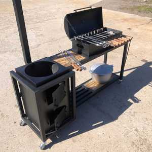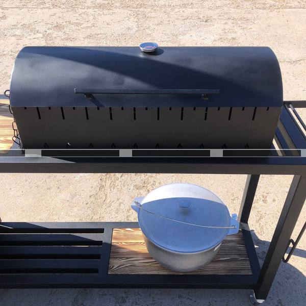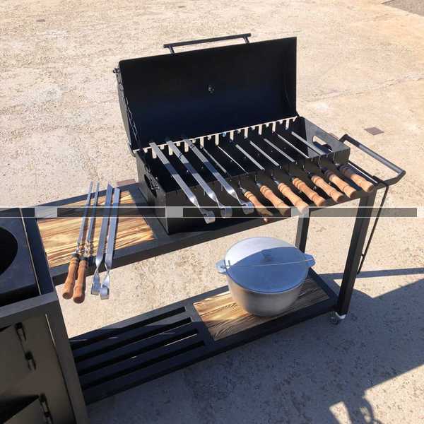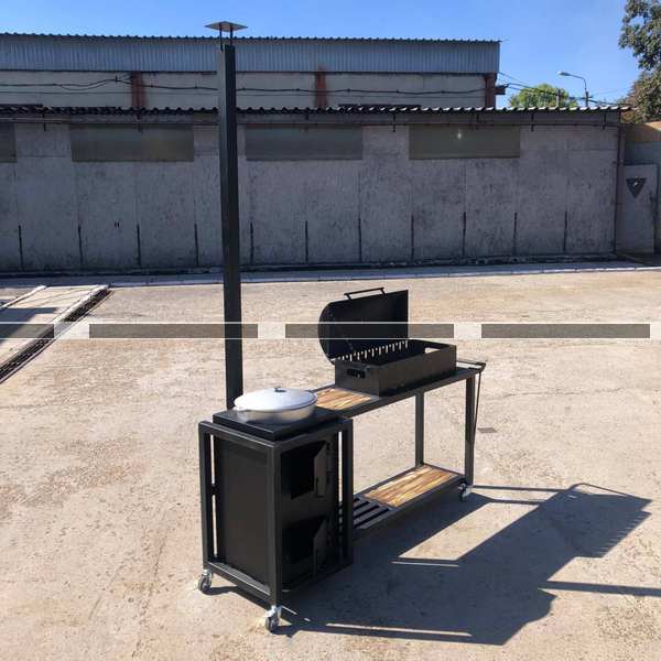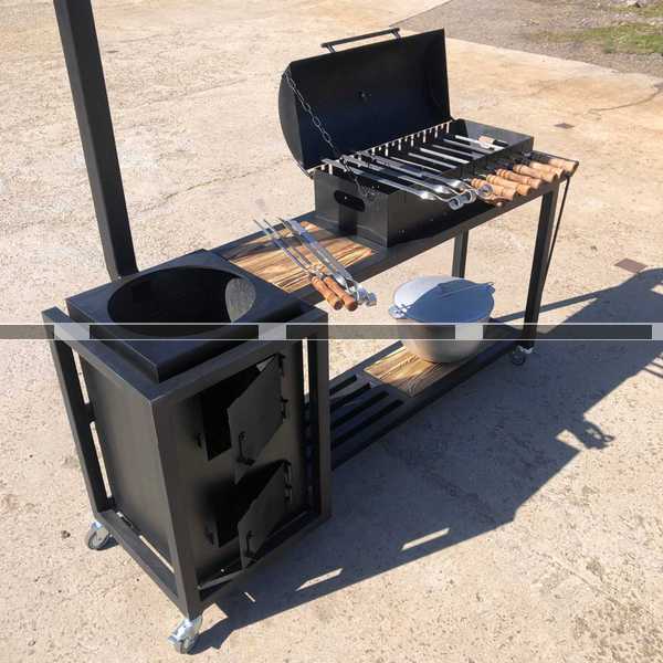 Мангальний комплекс 4в1Функціонал та можливості:1.Мангал – зручно готувати шашлик, люля-кебаб, овочі та інші страви на вугіллі.Оснащено дровнецею та поличкою для зберігання посуду.2.Гриль – під кришкою страва готується рівномірно, зберігаючи соковитість.Жаровня з кришкою (4 мм, 11 верхніх та 10 нижніх пазів) — витримує високу температуру та довго служить.3.Буржуйка з димоходом (3 мм) – для приготування у казані, обігріву зони відпочинку або використання як печі.Казан – ідеально для плову, бограчу, юшки та ароматних супів.4. Комплекс зручно траспортувати - Коліщатка із блокуванням та ручка із підставкою для шампурів.Технічні характеристики:Буржуйка: висота 660 мм, діаметр 400 мм, ширина 400 мм.Димохід: 1770 мм.Топка: 220×200 мм.Зольник: 220×150 мм.Жаровня: 700×300×170 мм (з кришкою — 700×300×250 мм).Робоча поверхня: 1860×570×800 мм.Висота до жаровні: 960 мм.Товщина сталі: 3–4 мм.Вага 120 кг